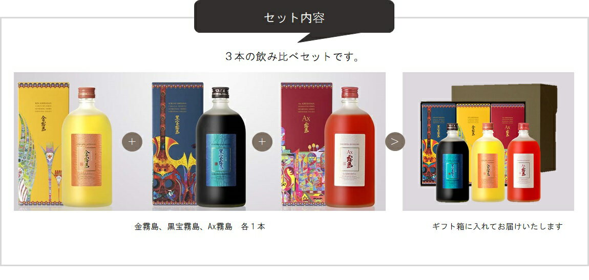 金霧島+黒宝霧島+Ax霧島セット 各720ml 25度 化粧箱入り 専用ギフト箱入り 霧島酒造 健麗酒 酒 冬虫夏草 チャーガ アスタキサンチン 黒霧島 黒霧島EX お中元 御中元 中元 残暑見舞 敬老 御祝 御礼 プレゼント ギフト 飲み比べ 記念