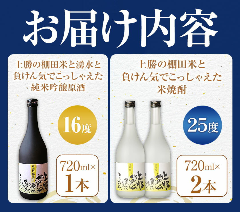 【ふるさと納税】上勝の棚田米と湧水と負けん気でこっしゃえた純米吟醸原酒720ml×1本 上勝の棚田米と負けん気でこっしゃえた米焼酎720ml×2本 3本セット 高鉾建設酒販事業部 《30日以内に出荷予定(土日祝除く)》酒 清酒 米焼酎 焼酎 お酒 徳島県 上勝町 送料無料