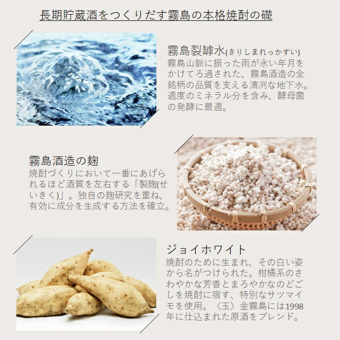 贅を尽くした霧島の逸品。1998年に仕込まれた芋焼酎をブレンド。さらに6つの自然の恵みを集結させたスイートな味わい。1916年創業の霧島酒造 宮崎よりお届け